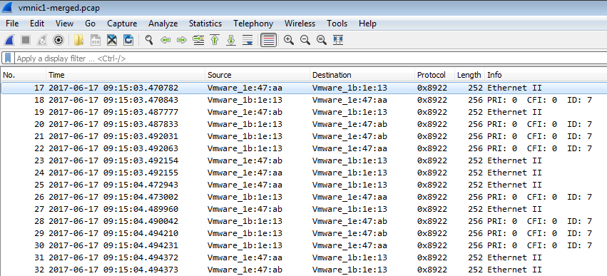 Before we dig into an individual frame, let’s look at the overall behavior. I was pretty surprised by the number of frames I observed in the brief capture period. In approximately 22 seconds, vmnic1 observed 178 frames.