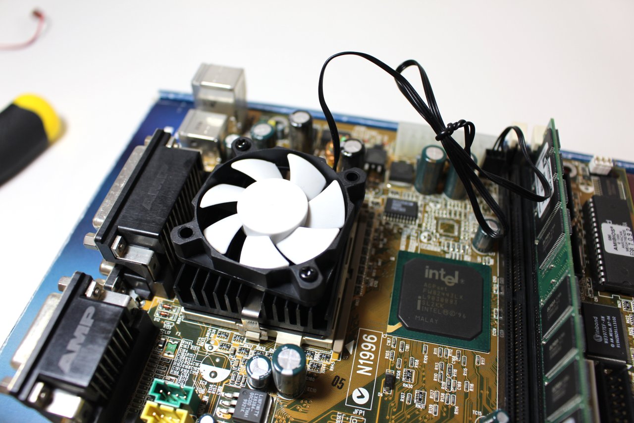 I had initially planned to use this 50mm Fractal Design R3 fan on the Celeron 333 I outlined in Part 1 of this series, but it fit perfectly on the retail socket 370 cooler. The included screws were the right size and length, but I had to angle the fan slightly so that they could be screwed in to the second row of fins that were spaced more tightly together. Even with only two screws the fan is held on very tightly and actually looks pretty good in my opinion.