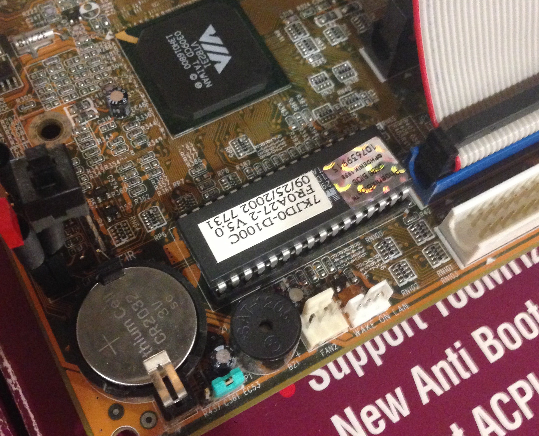 After looking through my collection of parts, I discovered two potential boards I could use for the hot flash process. The first was the ASUS P2B I covered in Part 1 of this series, but I really wasn’t keen on doing something that may damage that board. Thankfully I found an old AMD Athlon board with a similar looking BIOS chip on it.