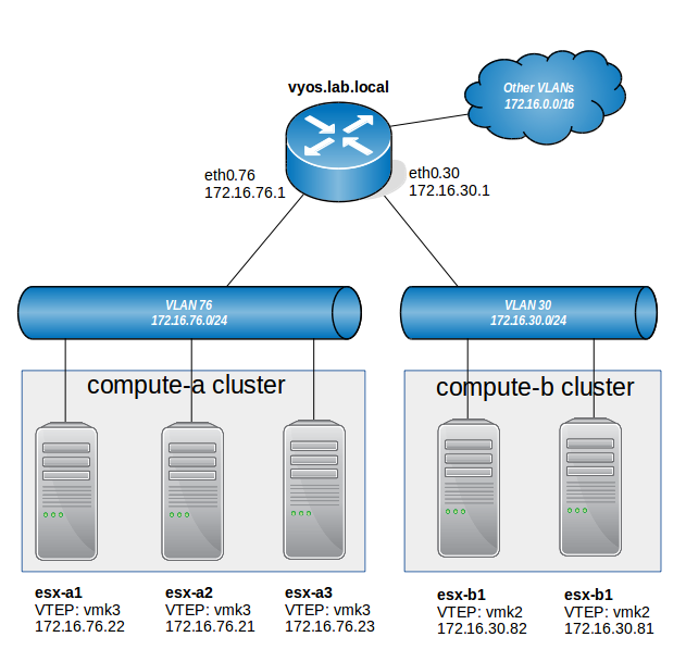Of note here, we can see that the VXLAN VTEPs for the hosts in compute-a are in VLAN 76 and the VTEPs for compute-b are in VLAN 30. Routing between these segments is provided by a router called vyos.lab.local.