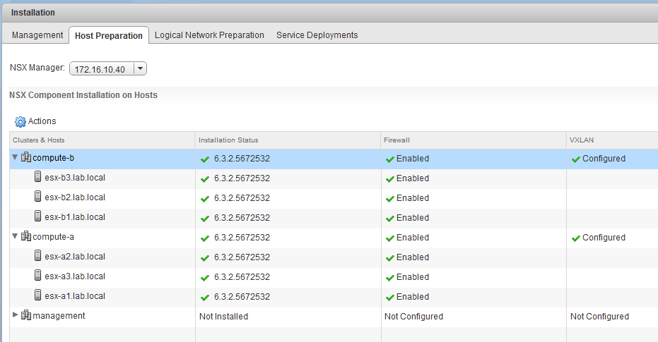 Next, let’s have a quick look at the NSX configuration. First, we can see that both clusters are prepped and have the VIBs installed: