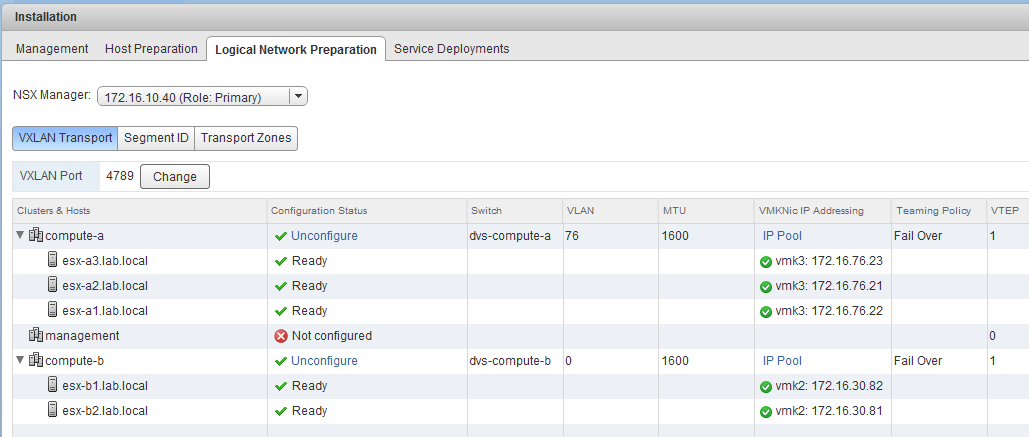 Below is a view of the VXLAN preparation. Take note that all hosts have VTEP IPs assigned and that compute-a and compute-b also have different Distributed Switches configured. Everything looks to be green. MTU is the default 1600, as expected.