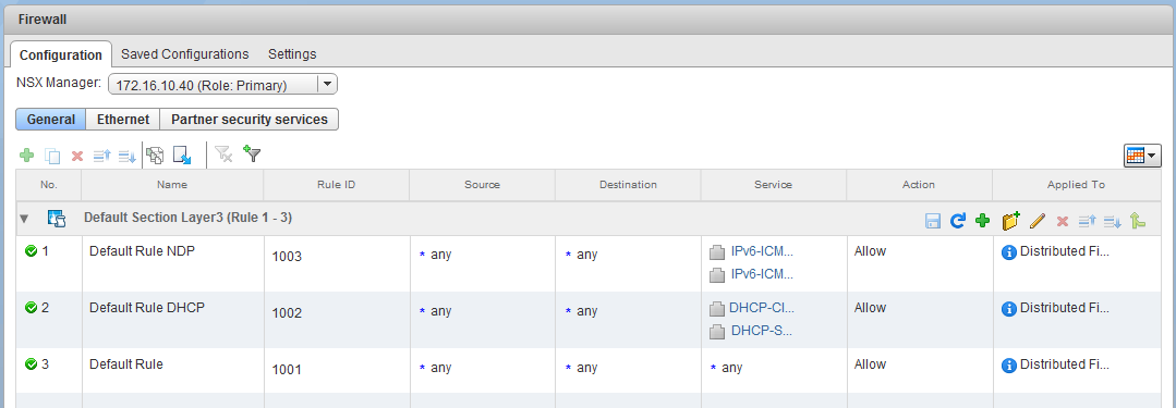 Although the Distributed Firewall is enabled on both clusters, it doesn’t appear that any custom rules have been defined. Only the default ‘allow’ rules exist in the default section.