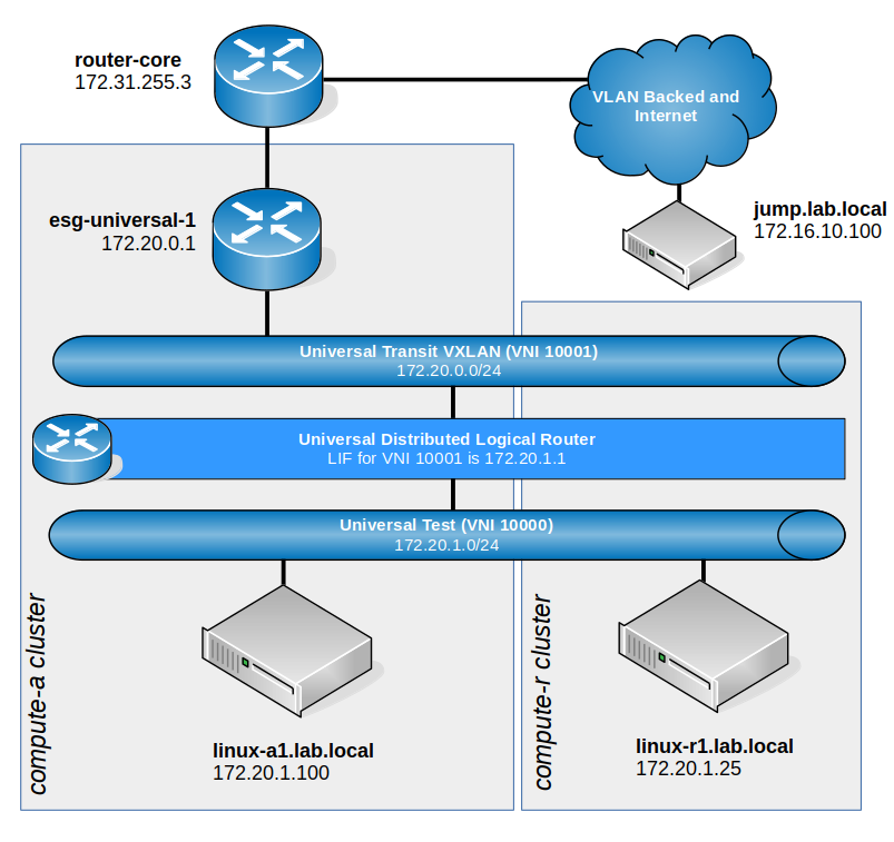 There isn’t a lot of detail above, but it helps to give us some talking points. The main location is depicted on the left. A three host cluster called compute-a exists there. All of the VLAN backed networks route through a router called vyos. The Universal Control Cluster exists at this location, as does the primary NSX manager.