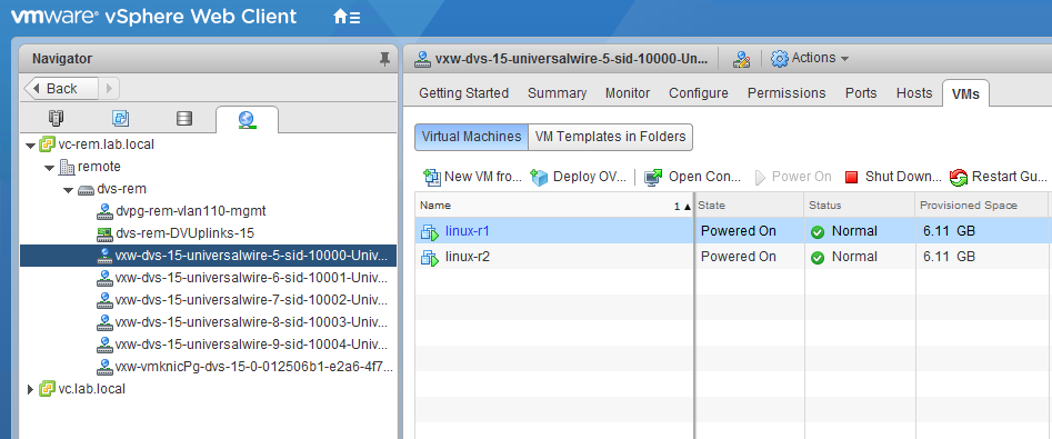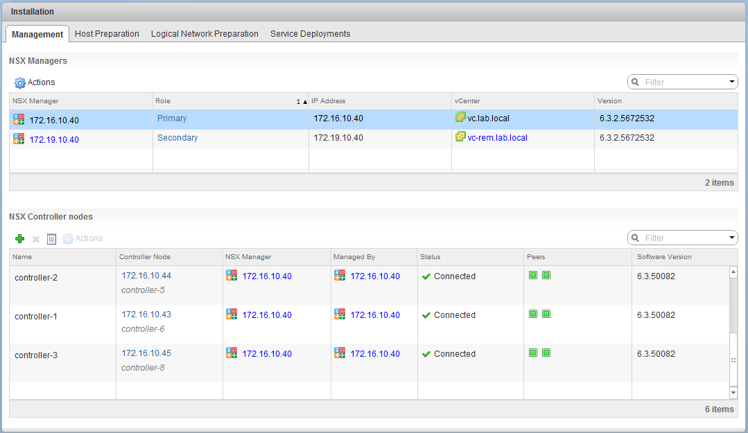 All three of the controller nodes at the primary location are connected and green. Remember – in a cross vCenter environment, only a single universal control cluster can exist. It’s normal not to have any controllers at the secondary location.