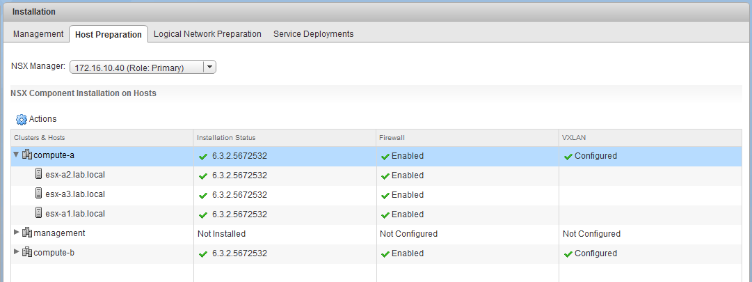 The ESXi hosts at the primary location look good. All VIBs are installed and Firewall and VXLAN looks green: