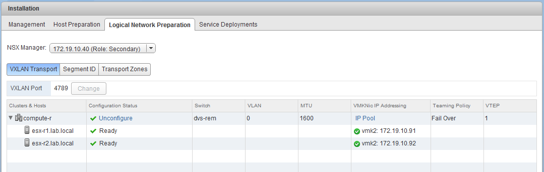 The VXLAN prep also looks good. Each host has a VTEP with the expected IP address assigned via the pool: