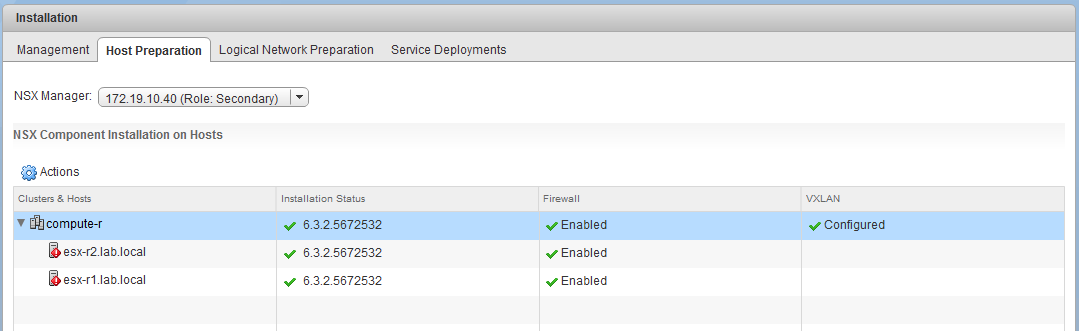 The same is true for the secondary location, but the hosts have red exclamation marks on them. This doesn’t seem to be related to installation status, firewall or VXLAN though: