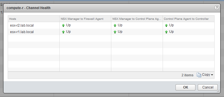 The communication channel health check was a new feature added in NSX 6.2 and makes it easy to see which hosts are having problems communicating with both NSX Manager and the Control Cluster. In our case, both esx-r1 and esx-r2 are reporting problems with their control plane agent (netcpa) to all three controllers.
