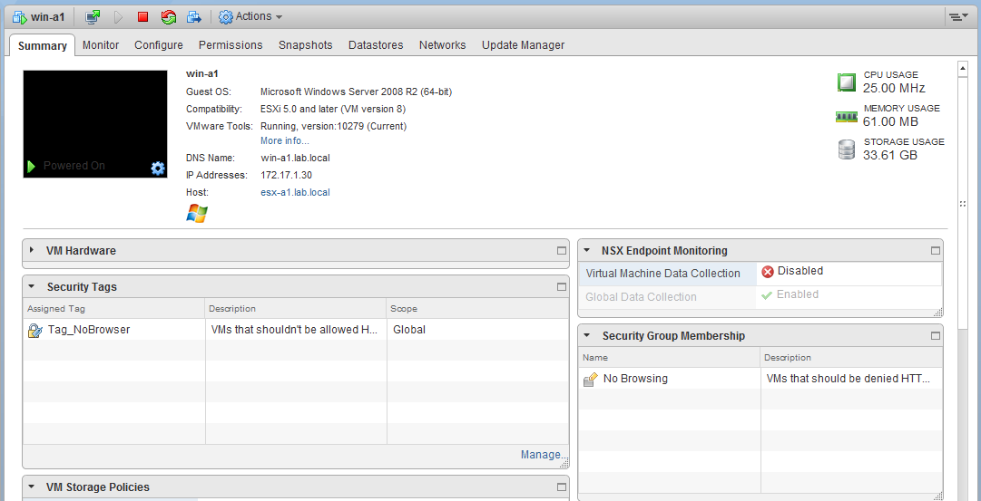 Looking at the individual VMs, we can see that they all have the security tag applied, and are correctly put into the ‘No Browsing’ security group as a result.