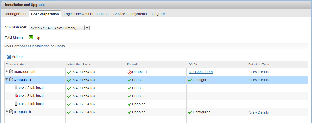 It looks like the DFW is enabled on the compute-a cluster. All hosts are showing as enabled with a green installation status. Host esx-a3 is showing with a red alarm, but because it’s in standby mode, this isn’t a concern.