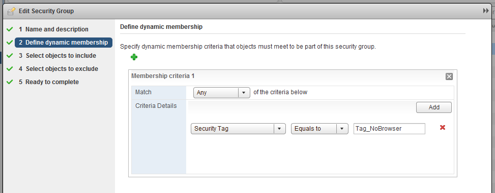 It appears to be quite simple – dynamic membership is used to put any VM with the security tag ‘Tag_NoBrowser’ into the group. No other objects are explicitly included or excluded.