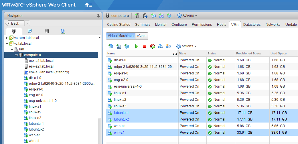 Looking at the Hosts and Clusters view, we can see that all three VMs are on hosts in the compute-a cluster. One host in the cluster appears to be in powered off by DPM.