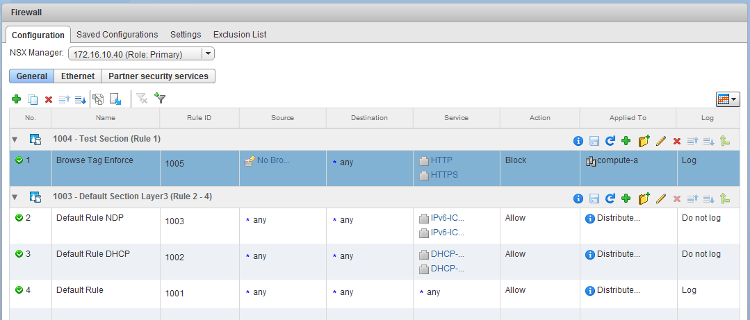 <?xml version="1.0" encoding="UTF-8"?> <firewallConfiguration timestamp="1519339055838"> <contextId>globalroot-0</contextId> <layer3Sections> <section id="1004" name="Test Section" generationNumber="1519339055838" timestamp="1519339055838" tcpStrict="false" stateless="false" useSid="false" type="LAYER3"> <rule id="1005" disabled="false" logged="true"> <name>Browse Tag Enforce</name> <action>deny</action> <appliedToList> <appliedTo> <name>compute-a</name> <value>domain-c121</value> <type>ClusterComputeResource</type> <isValid>true</isValid> </appliedTo> <snip>