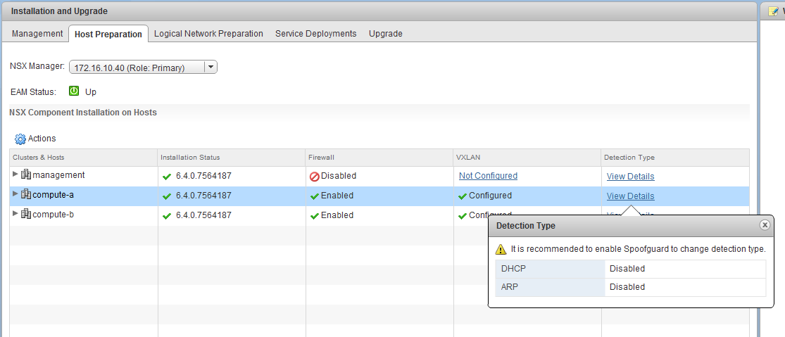 In NSX 6.4.0, a column has been added in the host preparation section to display the enabled IP detection methods. As can be seen above, DHCP and ARP snooping are disabled leaving only VMware Tools address reporting.