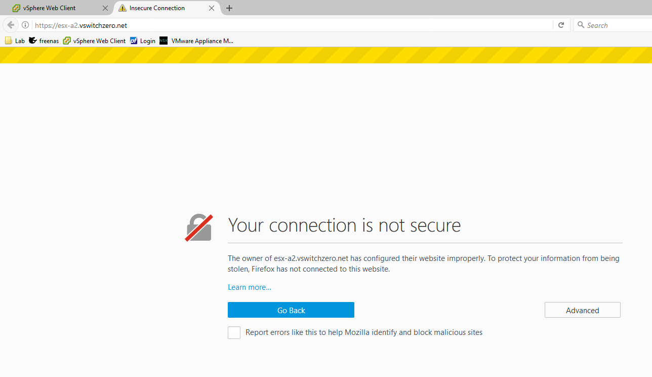 vCenter Server will broker the initial connection between your client workstation and the ESXi host, but ultimately, the client machine must be able to access the ESXi host vCenter has selected via HTTPS. If your lab is like mine, self-signed certificates are everywhere and ESXi is no different. I had visited the vSphere Client UI on several of my hosts since the rebuild, but esx-a2 was not one of them.
