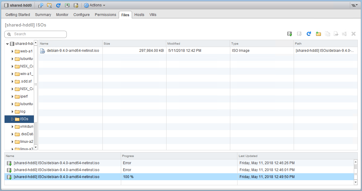 As you can see above, the self-signed certificate is not trusted in Firefox. If the browser disallows HTTPS to esx-a2, the file upload can’t proceed. Once I added an exception, I was able to upload my file successfully: