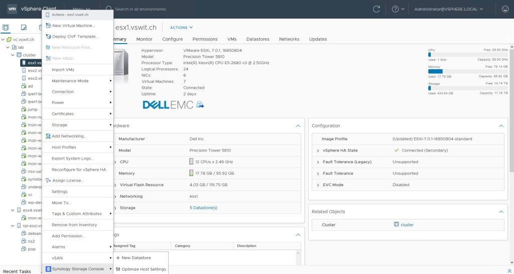 I’ve been playing around with Synology’s DS1621+ in my home lab the last couple of weeks and have been thoroughly impressed so far. In my last couple of posts, I got the storage pools created and networking and iSCSI configured. As I was going through the manual setup process, I came across Synology’s Storage Console for VMware plugin. This plugin allows some degree of control of the NAS unit directly from within the vSphere Client and automates some simple workflows. Here are some high level features: