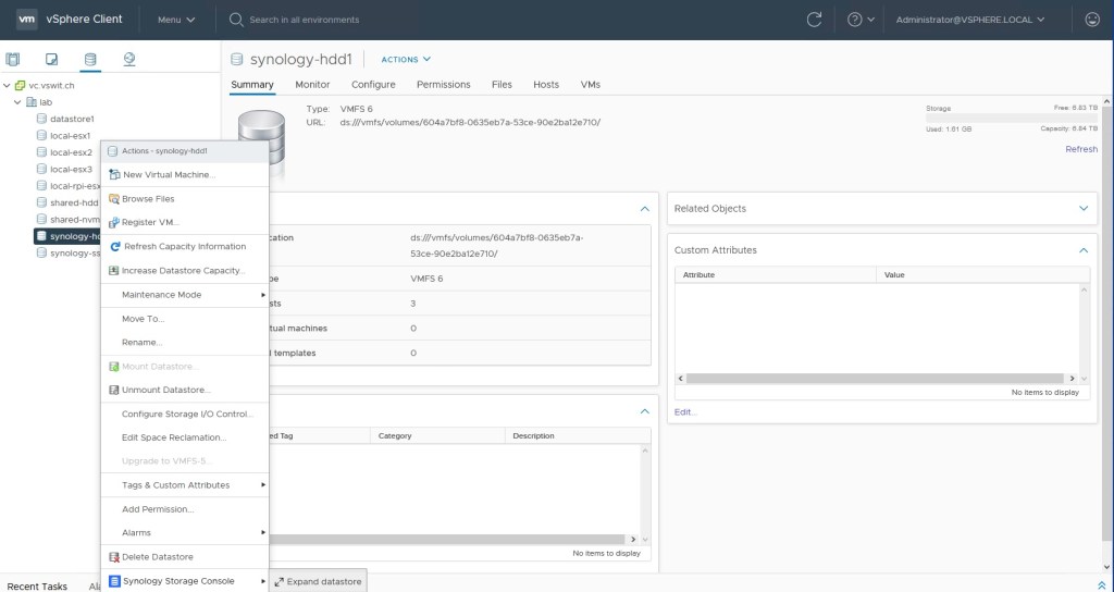 As seen above, there are a number of automated tasks that get performed during datastore creation, including iSCSI target addition, rescans and datastore creation. This is in addition to what is being done on the Synology NAS behind the scenes as well.