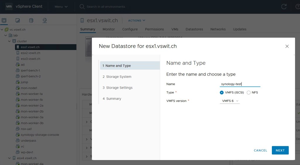 Both VMFS and NFS datastores can be created using the new datastore wizard. This can all done without ever having to login to the NAS.