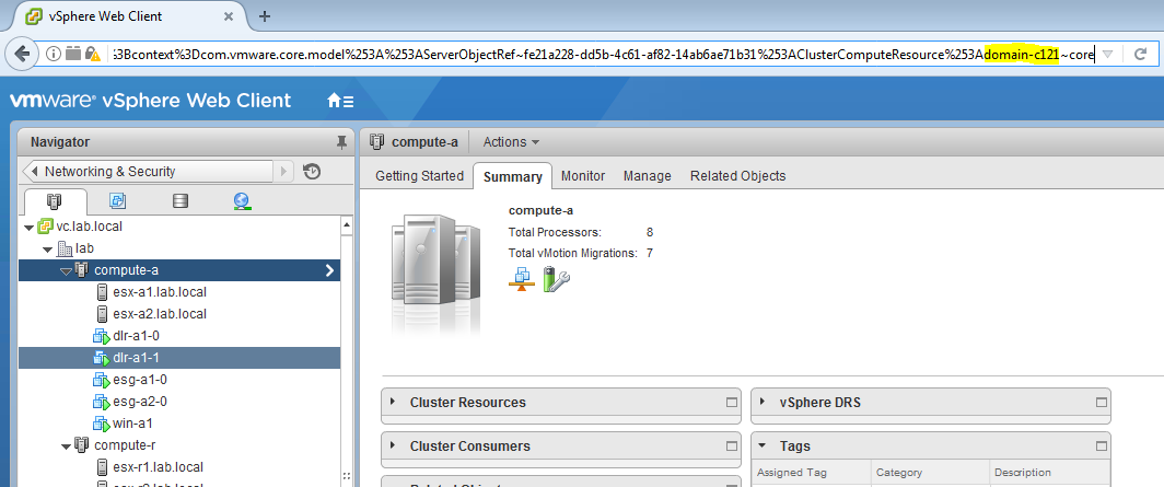 As you have probably noticed, vSphere clusters are often the configuration delimiter for many things in NSX, including host preparation, firewall status etc. As such, many API calls will reference cluster objects. The cluster moref is not prefixed by ‘cluster-‘ as you might expect, but rather ‘domain-c‘. To determine the cluster moref, we can use the same trick that we used for finding the virtual machine IDs. As you’ll discover the URL address in the vSphere Web Client can tell us the moref for numerous objects.