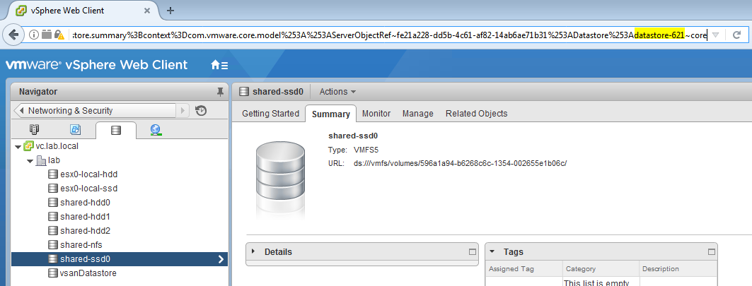 Above you can see my datastore called shared-ssd0 equates to moref datastore-621.