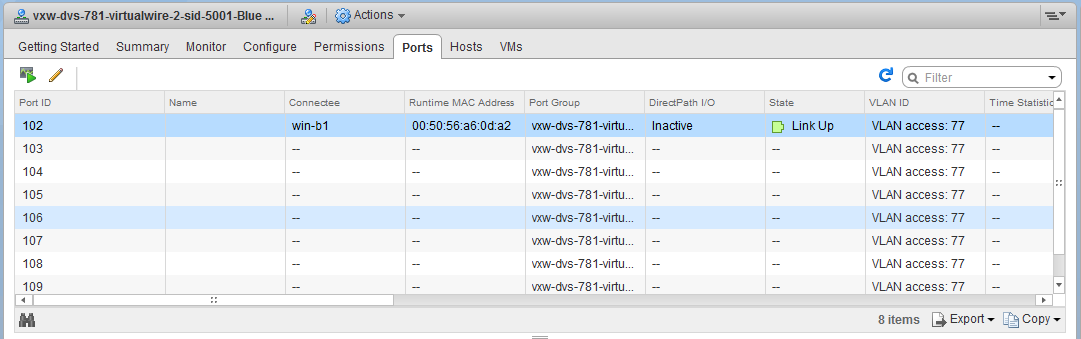 I then navigated to the Networking view in vCenter to have a look at the DVS associated with the compute-b cluster. In the ‘Ports’ view, you can get a good idea of what exactly is still connected to the distributed switch. To my surprise a VM called win-b1 was actually still showing as ‘Active’ and ‘Connected’ to the dvPortgroup associated with a Logical Switch!