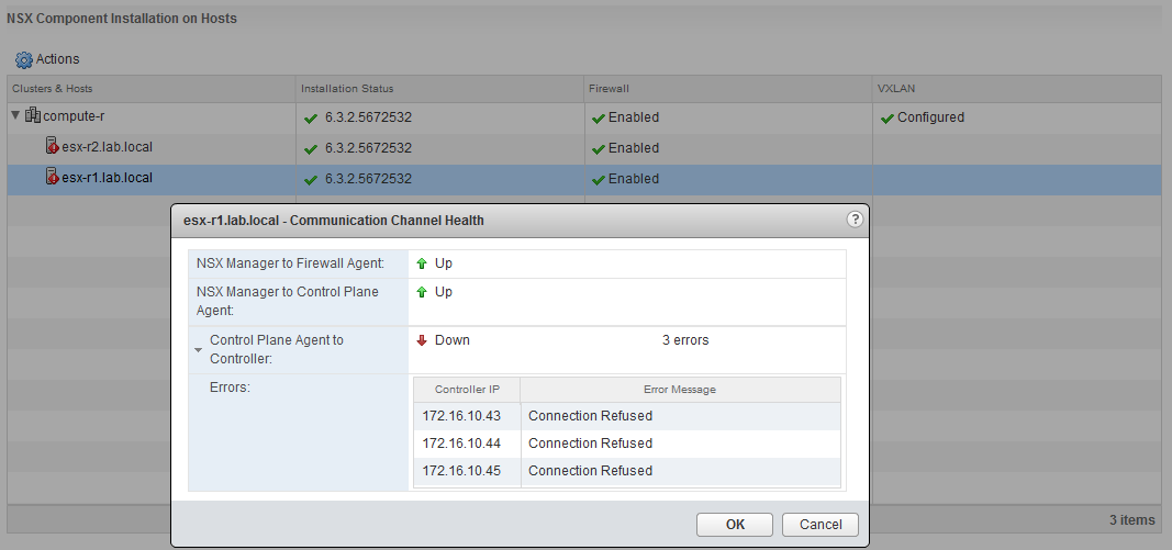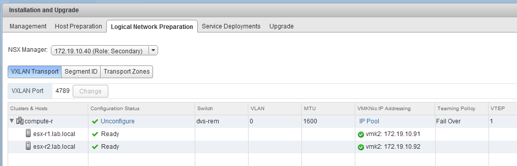 In the host preparation section, we can see that dvs-rem is indeed the configured distributed switch for the compute-r cluster and that both hosts look good from a VTEP/VXLAN perspective: