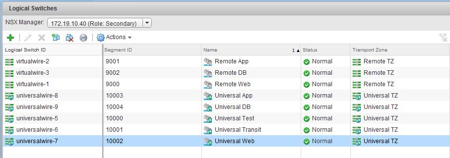 As we can see above, the port groups do exist for logical switches in the VNI 900x range. These are non-universal, logical switches available to the secondary NSX deployment only.