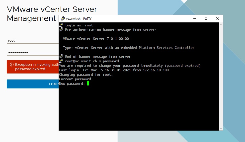Thankfully, resetting your password is a piece of cake via CLI. SSH should be enabled by default for your vCenter Server. Simply login using your favorite SSH client and you’ll be greeted by a password change prompt: